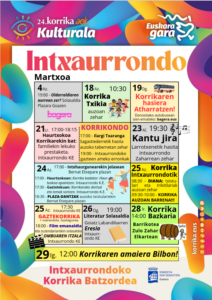 Korrika kulturala Intxaurrondon Martxoak 23, astelehena19:30 Kantujira Larrotxenetik hasita, Intxaurrondo Zaharrean zehar. Martxoak 24, asteartea17:00 Korrika badator: Haurtxokoa apaintzen Intxaurrondo Kultur Etxeko haurtxokoan.17:30 Korrikarako dortsal eta lemak sortzen