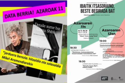 Azaroaren 11n Adania Shibli-ren, ‘Detaile xume bat’ liburuaz LITERATURA PLAZARA 2025eko aroaren 11n 19:30etan, ostegunarekin, Iratxe Retolazak gidatuta. Saio guztiak Intxaurrondo Kultur etxean (Goiko kiroldegian), Etorri liburu hau gurekin komentatzera Azaroak 11 (urriaren 30 zen,