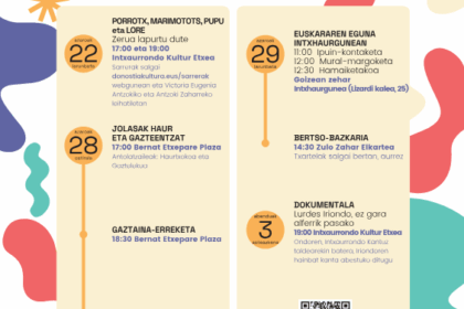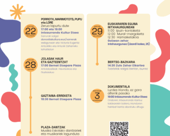 Ikasturte hasierarekin batera, auzoan garatuko diren hainbat ekitaldiren berri ematera gatozkizu: Intxaurrondo zaharreko jaiak: Irailaren 6tik 14ra bitartean. Egitaraua erantsita bidaltzen dizugu. Donostia Kulturako ikastaroak: Aurten ere, euskarazko ikastaroetan izena emateko deialdia egiten dizuegu. Euskarazko ikastaroetan