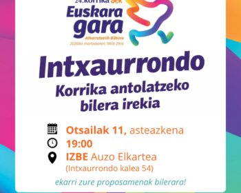 KORRIKA antolatzeko 2. BILERA IREKIA Eguna: Otsailaren 11an, asteazkena,Ordua; 19:00etanTokia: IZBE auzo elkartea ( Intxaurrondo kalea 54) Auzotar eta auzoko talde guztiak gonbidatuta zaudete bertara eta proposamenak ekartzea eskertuko dizuegu.-----------------------------------------------------------------------Martxoaren 25ean pasako da Korrika auzotik,