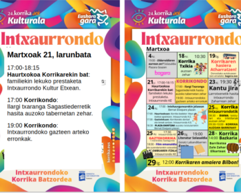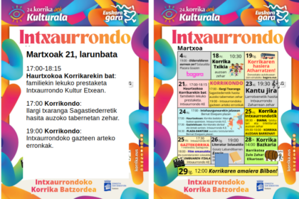 Martxoak 21, larunbata17:00-18:15 Haurtxokoa Korrikarekin bat: familiekin lekuko prestaketa Intxaurrondo Kultur Etxean. 17:00 Korrikondo:Ilargi txaranga Sagastiederretik hasita auzoko tabernetan zehar.19:00 Korrikondo:Intxaurrondoko gazteen arteko erronkak. Intxaurdi - BizkaiaIzei - ZuberoaIzazpi - ArabaEl parque - DonostiaTalai -