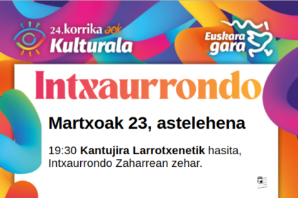 Korrika kulturala Intxaurrondon Martxoak 23, astelehena19:30 Kantujira Larrotxenetik hasita, Intxaurrondo Zaharrean zehar. Martxoak 24,